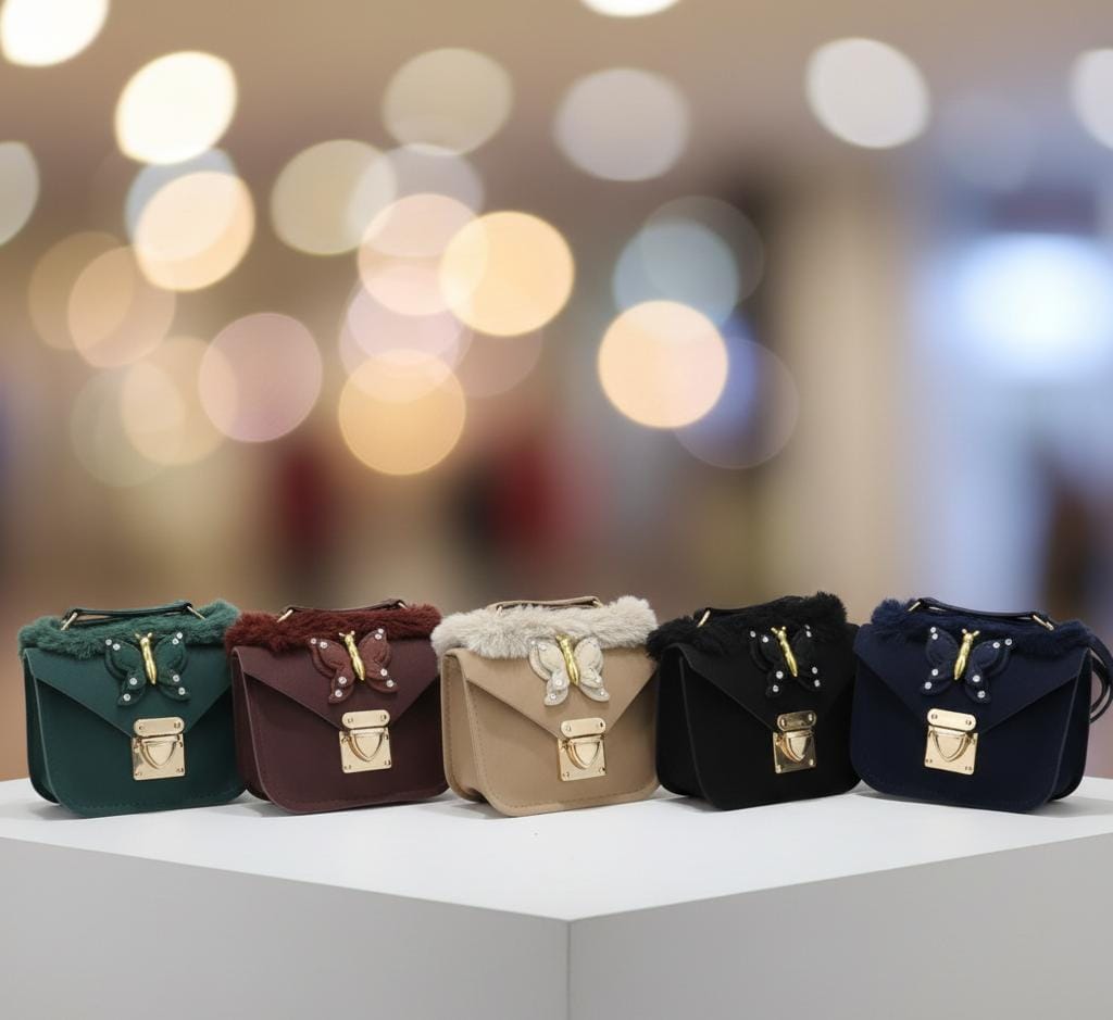 Adorable mini bags featuring golden butterfly embellishments and soft fur trim. Available in green maroon beige black and navy. Perfect for parties celebrations and fashion accessories.