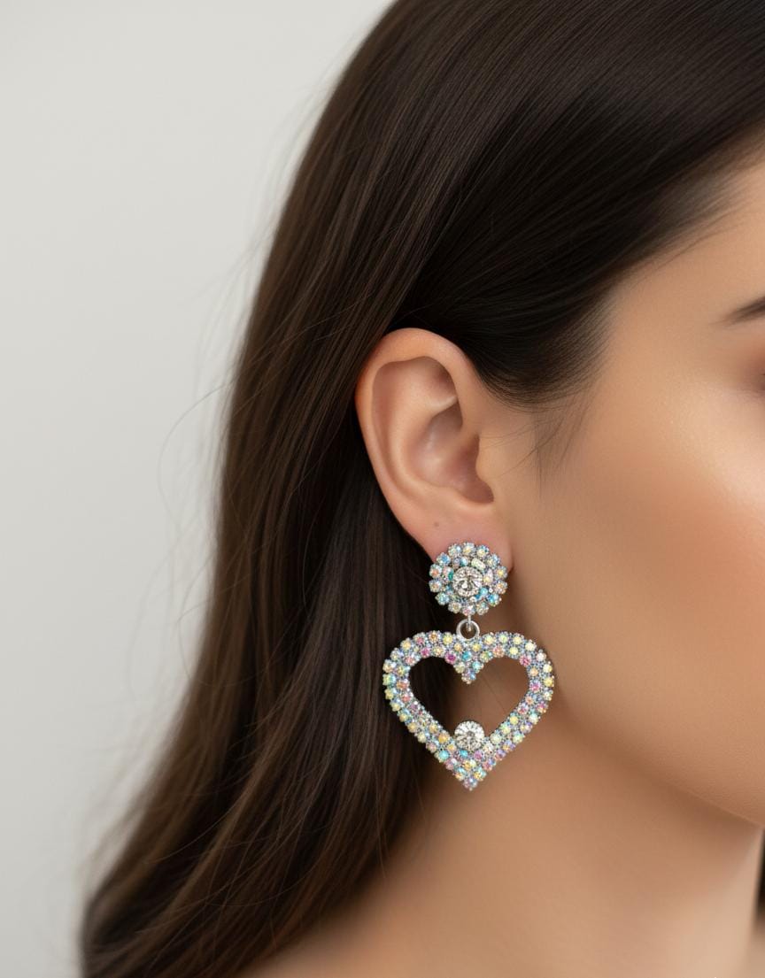 These earrings feature a crystal-studded circular stud top, paired with a heart-shaped open drop frame encrusted with shimmering crystals. The subtle sparkle and balanced silhouette create an effortlessly graceful look that shines without overwhelming.