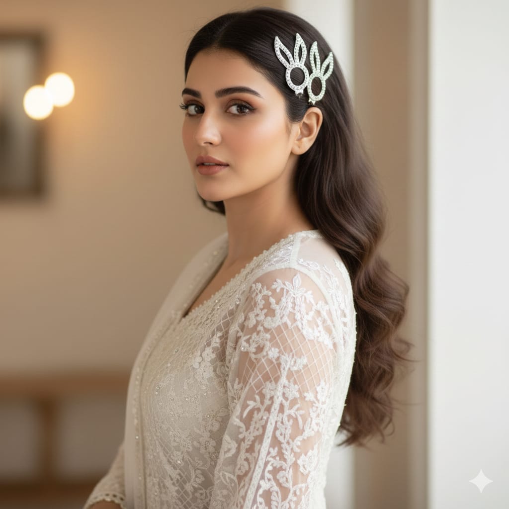 Designed in a sleek bunny-ear shape and embellished with shimmering crystal stones, this hair pin creates a refined statement when worn on the side or with half-up hairstyles. Its clean, symmetrical design makes it perfect for both contemporary and festive looks.