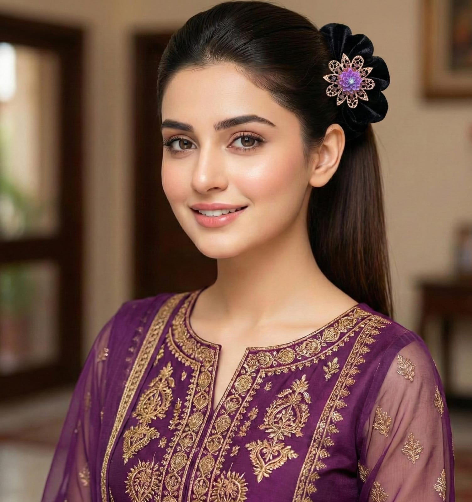 Enhance your ponytail with elegance and grace using this Velvet Floral Ponytail Holder, a premium hair accessory designed for women and girls who want a refined yet trendy look. Combining soft velvet fabric with a delicate floral ornament, this piece adds instant charm to any hairstyle without effort.