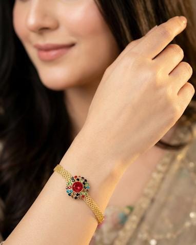 This exquisite bracelet embodies traditional jewelry elegance with its sophisticated mesh chain construction and prominent gemstone centerpiece. The piece features fine gold-toned chains woven together to create a flexible yet substantial band that drapes beautifully on the wrist. The centerpiece showcases a rich red gemstone surrounded by a halo of clear crystals, creating a floral or star-burst pattern that serves as the focal point of the design. The warm gold combined with deep red creates a color palette associated with prosperity, celebration, and luxury across cultures. This bracelet is particularly suited for traditional occasions including weddings, religious ceremonies, cultural festivals, and formal family gatherings. The mesh construction demonstrates exceptional craftsmanship, with each individual link carefully connected to create smooth, flexible structure. The bracelet conforms naturally to the wrist shape, providing comfortable wear throughout extended events. Despite its delicate appearance, the quality construction ensures durability and longevity. The gemstone setting secures the stones firmly while allowing maximum light exposure for brilliant sparkle. This bracelet works beautifully as part of complete jewelry sets coordinating with necklaces and earrings, or it can be worn as a standalone statement piece. The traditional design elements make it particularly appropriate for South Asian cultural celebrations, though its universal beauty transcends specific cultural boundaries. The adjustable closure accommodates various wrist sizes while maintaining the bracelet’s elegant line. This piece represents the kind of jewelry that holds both aesthetic and sentimental value, often becoming part of family jewelry collections passed through generations. The timeless design ensures this bracelet remains appropriate and stylish regardless of changing fashion trends, making it a wise investment in both beauty and tradition.