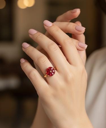 This spectacular ring showcases bold design confidence through its impressive ruby cluster arrangement. The piece features multiple ruby-red gemstones grouped together creating substantial visual impact and luxurious presence. The cluster design allows for impressive overall size while maintaining wearability and comfort. Each ruby displays rich red coloring that symbolizes passion, celebration, and prosperity across cultures. The warm gold setting provides framework that enhances each individual stone while creating unified design. The substantial presence makes this ring ideal for celebrations, formal events, cocktail parties, and any occasion where statement jewelry is appreciated. This ring works beautifully for those who embrace bold fashion choices and aren’t hesitant to let their jewelry make impressions. The cluster arrangement creates dynamic play of light as each stone catches illumination from different angles. This ensures the ring maintains visual interest and sparkle in all lighting conditions. The quality construction secures each gemstone firmly while the comfortable band design allows extended wear. This piece represents cocktail ring styling at its finest – impressive, luxurious, and unabashedly glamorous. The ring pairs beautifully with formal evening wear including gowns and elegant cocktail dresses. It also works with traditional ethnic attire, particularly during festival celebrations and cultural ceremonies. The ruby cluster makes this ring particularly appropriate for milestone celebrations, significant anniversaries, and important life achievements. The substantial design ensures this piece becomes conversation starter and focal point rather than subtle accessory. This represents investment jewelry with both aesthetic and emotional value, the kind of piece associated with memorable occasions and special moments. The classic appeal of ruby gemstones combined with timeless cluster design ensures this ring remains stylish across generations, potentially becoming treasured family jewelry with stories attached to its sparkle.