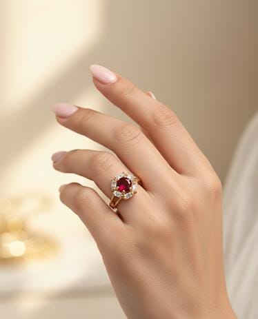 Beautiful gold ring featuring ruby gemstone in floral cluster setting. Romantic and elegant design for special occasions.