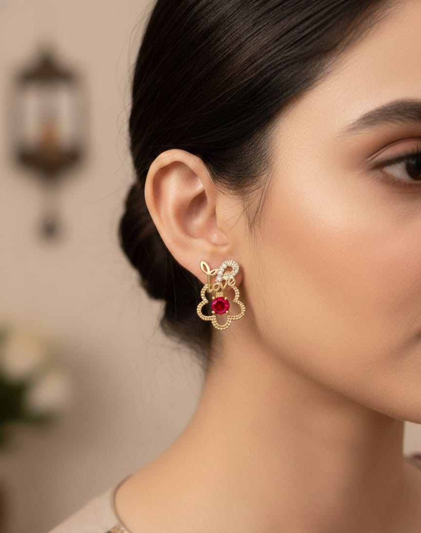 Materials: Gold-tone alloy, faceted ruby-red crystal, and micro-pavé accents.