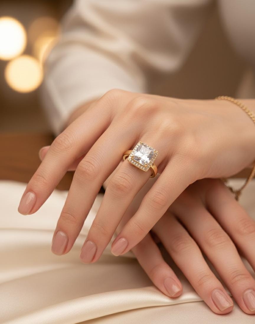 This breathtaking ring combines vintage-inspired design elements with modern craftsmanship and materials. The centerpiece features a magnificent cushion cut diamond or clear crystal, characterized by its square outline with rounded corners and brilliant faceting pattern. This cut has been popular for centuries, offering timeless appeal with romantic vintage aesthetics. Surrounding the cushion cut center is an elaborate halo of smaller clear crystals creating additional dimension and brilliance. This halo design draws inspiration from vintage jewelry periods particularly Art Deco styling, appealing to those who appreciate historical design elements. The rose gold setting provides contemporary warmth that updates the vintage design for modern sensibilities. The band features smooth elegant construction that ensures comfortable daily wear. This ring represents perfect choice for romantic souls who appreciate vintage aesthetics, historical design references, and timeless beauty. The cushion cut offers brilliant sparkle with softer, more romantic appearance than modern cuts. The halo embellishment adds glamorous dimension characteristic of vintage jewelry while increasing the overall visual size and impact. The substantial presence makes this ring suitable for formal occasions, special celebrations, and daily wear as cherished wedding jewelry. The quality construction ensures all stones remain securely set within their vintage-inspired framework while allowing maximum brilliance. The rose gold provides flattering warmth against all skin tones while coordinating with other jewelry pieces. This ring works beautifully alone as statement piece or paired with complementary bands for complete bridal set. The combination of vintage-inspired design, brilliant sparkle, and contemporary metal creates jewelry that bridges past elegance with present style. This represents investment in both beauty and meaning, as engagement rings become treasured symbols of commitment spanning lifetime. The vintage aesthetic ensures this ring maintains relevance across changing trends, as historical design elements remain perpetually appealing to those who appreciate craftsmanship, romance, and timeless elegance in their jewelry choices.