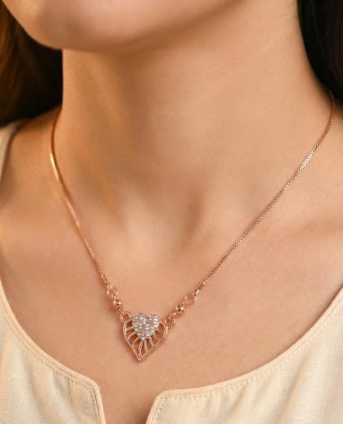 Delicate rose gold layered necklace with crystal leaf heart pendant. Nature-inspired romantic design for elegant everyday styling.