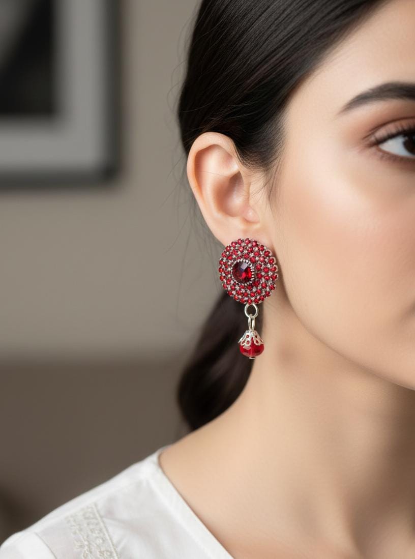 These earrings feature a round crystal-studded design, centered with a deep ruby red stone, and finished with a glossy red drop accent that adds graceful movement. The layered crystal detailing enhances the brilliance, creating a striking yet balanced silhouette.