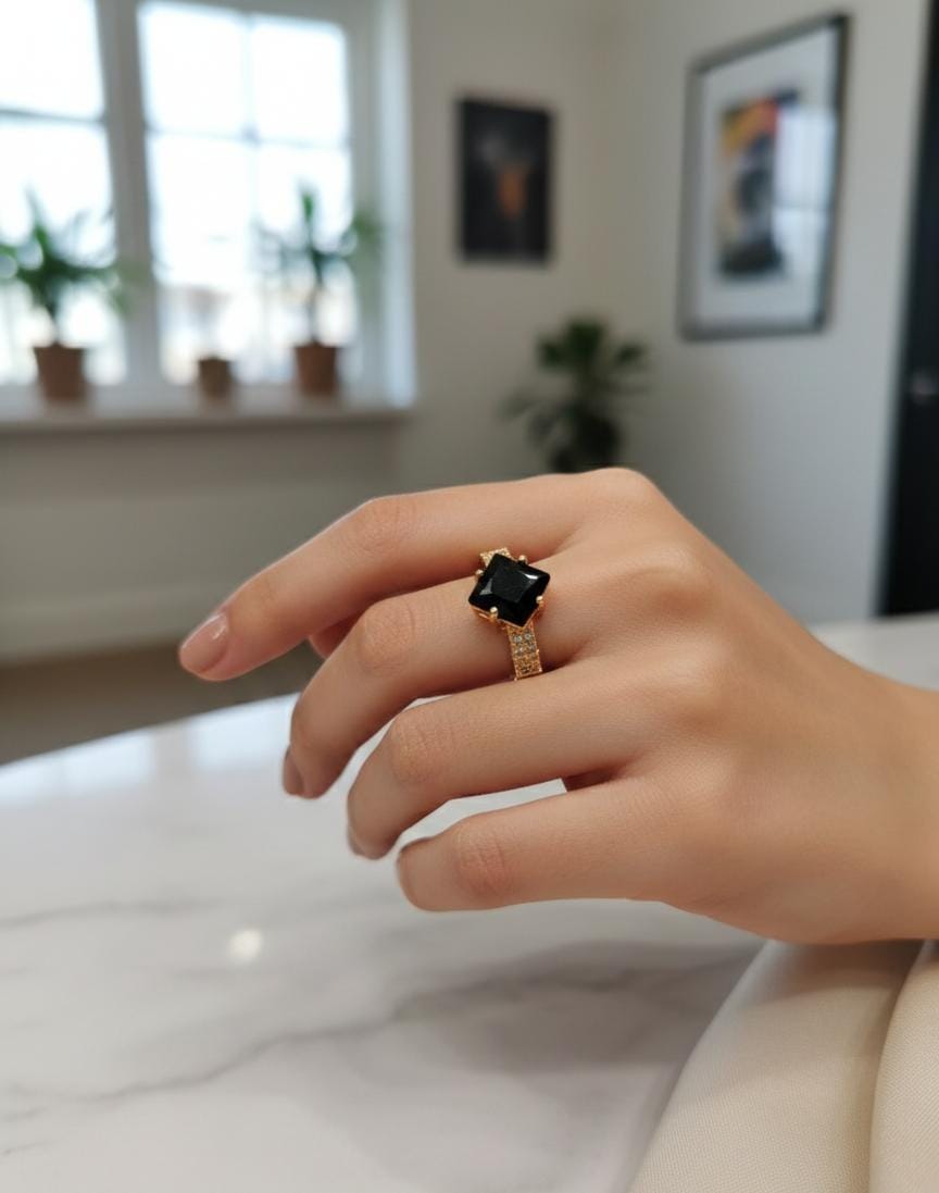 Square Black Stone Ring with Elegant Golden Band – Stylish Fashion JewelrySquare Black Stone Ring with Elegant Golden Band – Stylish Fashion Jewelry