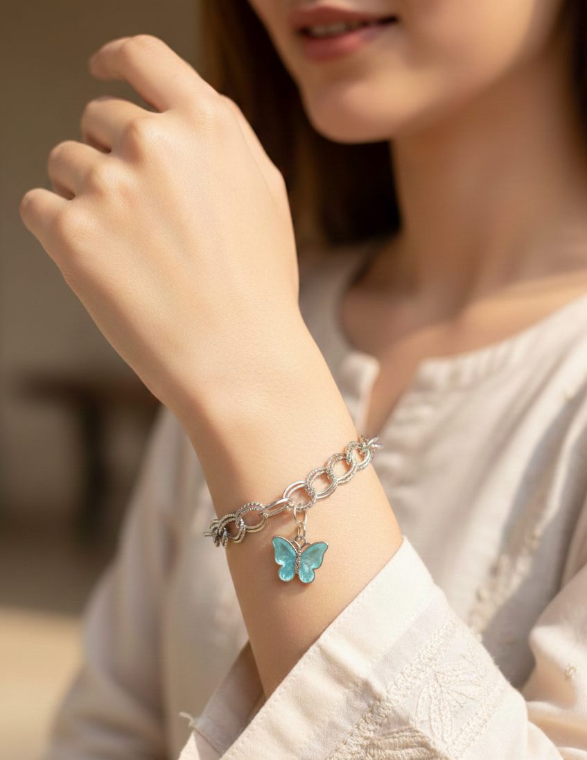 Vibrant Butterfly Charm: Suspended at the center is a beautifully detailed butterfly charm, finished in a translucent azure-turquoise enamel that mimics the natural glow of a butterfly’s wing.