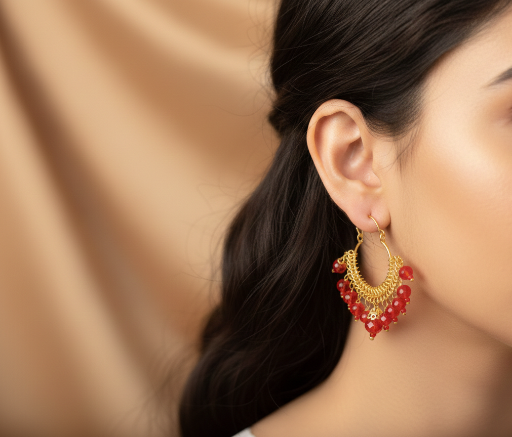 The bold red and gold palette makes these an ideal match for traditional ethnic wear like lehengas or anarkalis. For a more modern fusion look, pair them with a crisp white linen shirt and gold bangles to let the crimson beads take center stage.